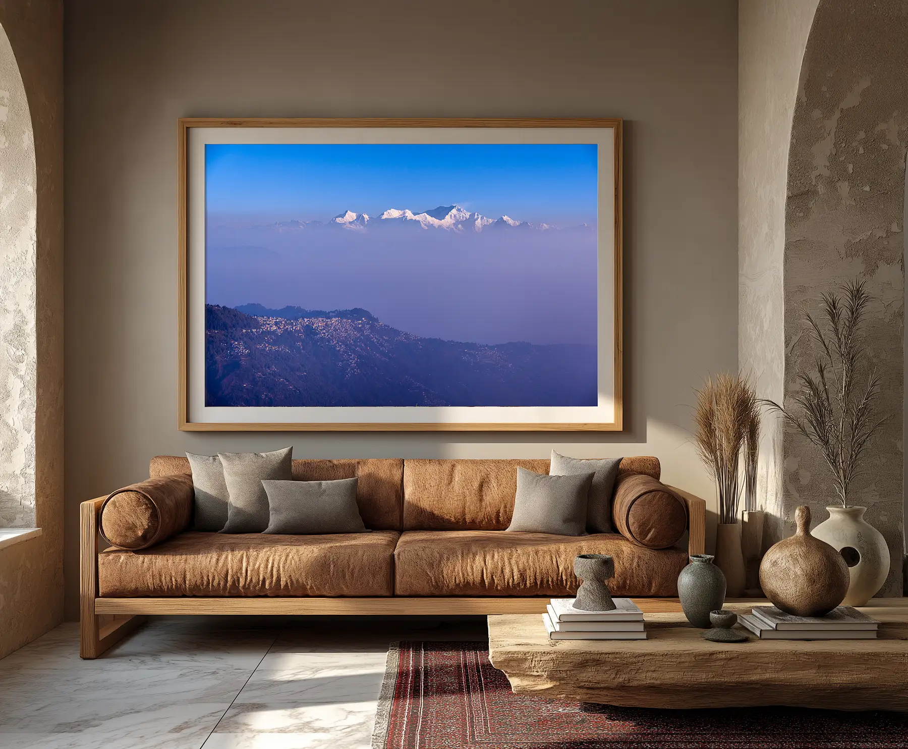 As dawn softly illuminates the Himalayan landscape, the city of Darjeeling slowly awakens beneath the majestic presence of Kanchenjunga. The snow-capped peaks glow serenely, standing guard over the mist-laden valley below, capturing the tranquil harmony between nature’s grandeur and human settlement.