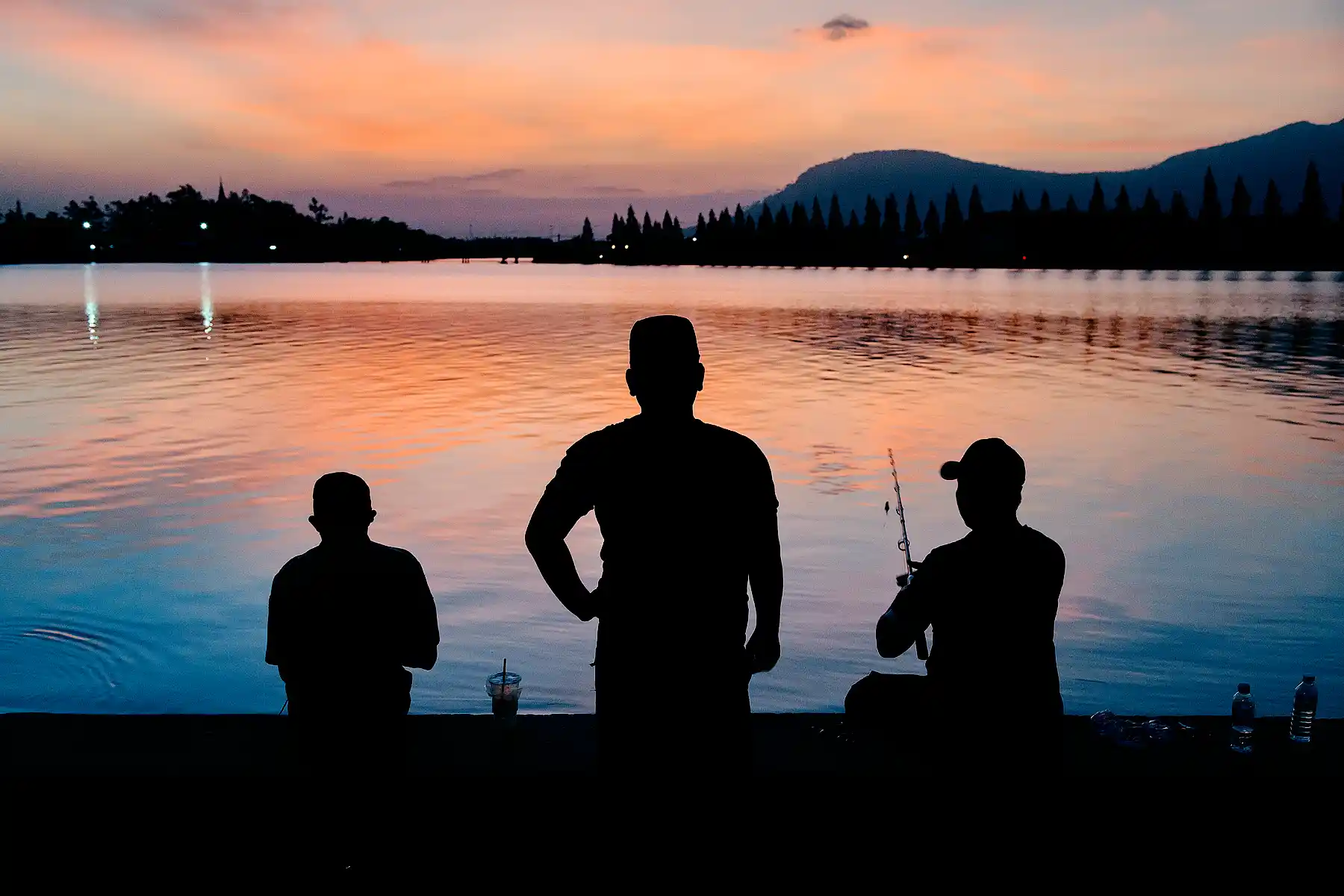 As the sun sets over the calm Praek Tuek Chhu River, three fishermen share a quiet moment by the water’s edge.