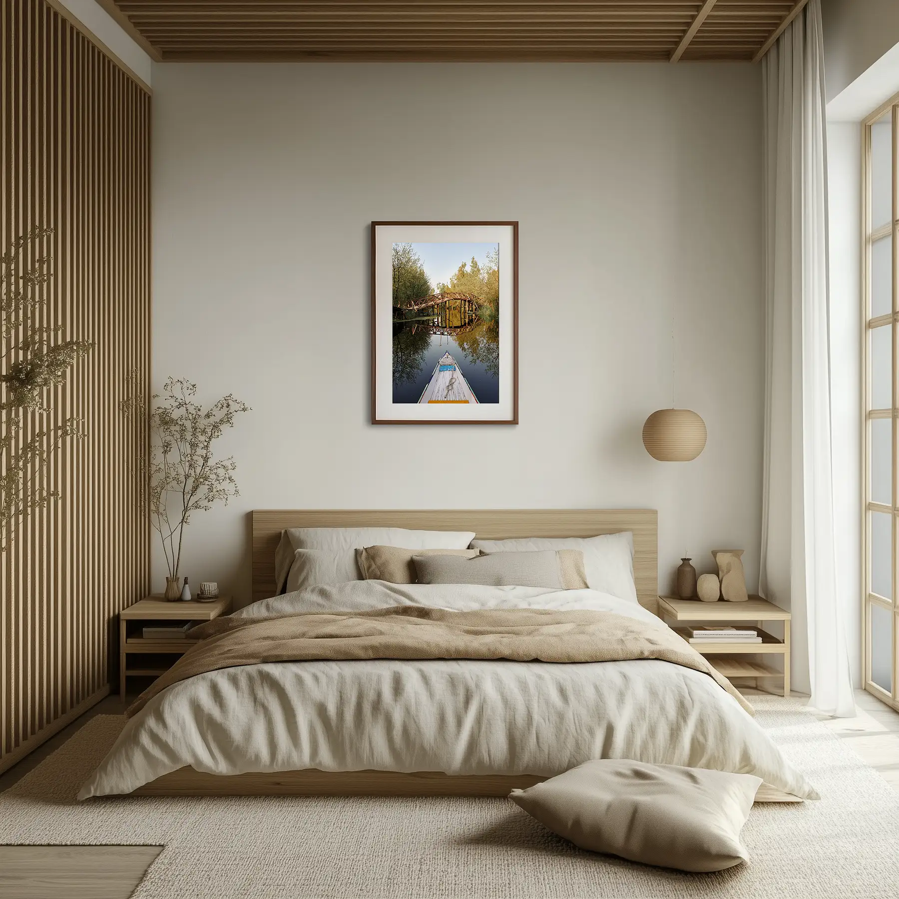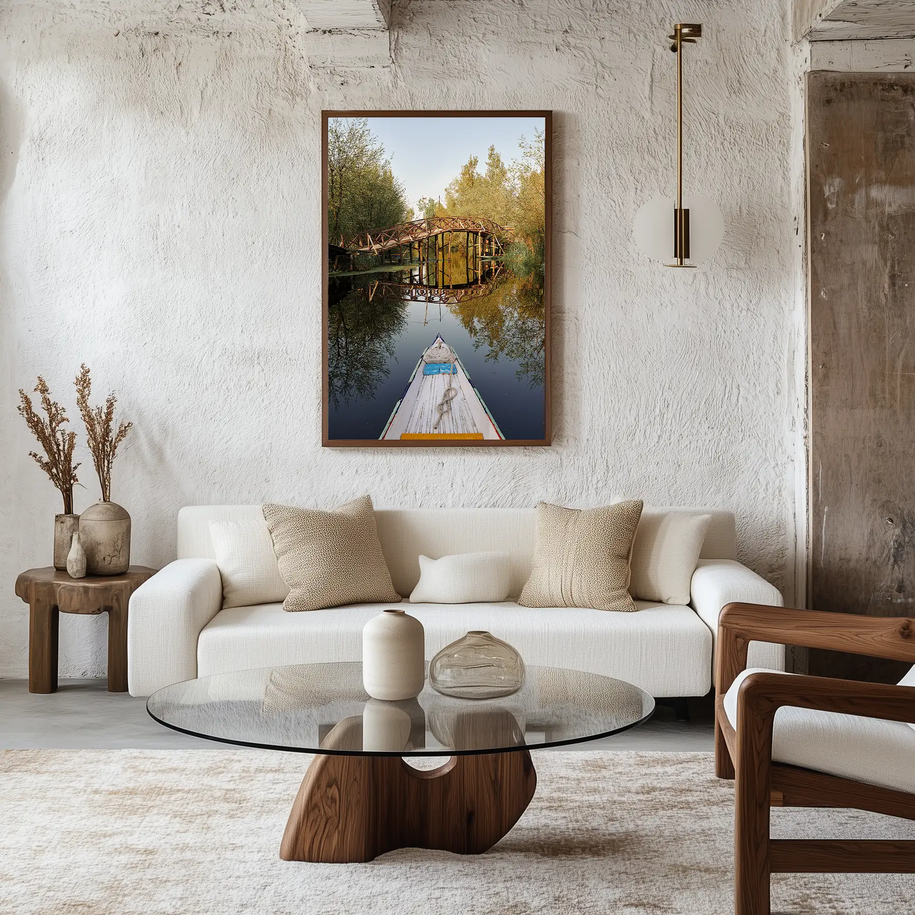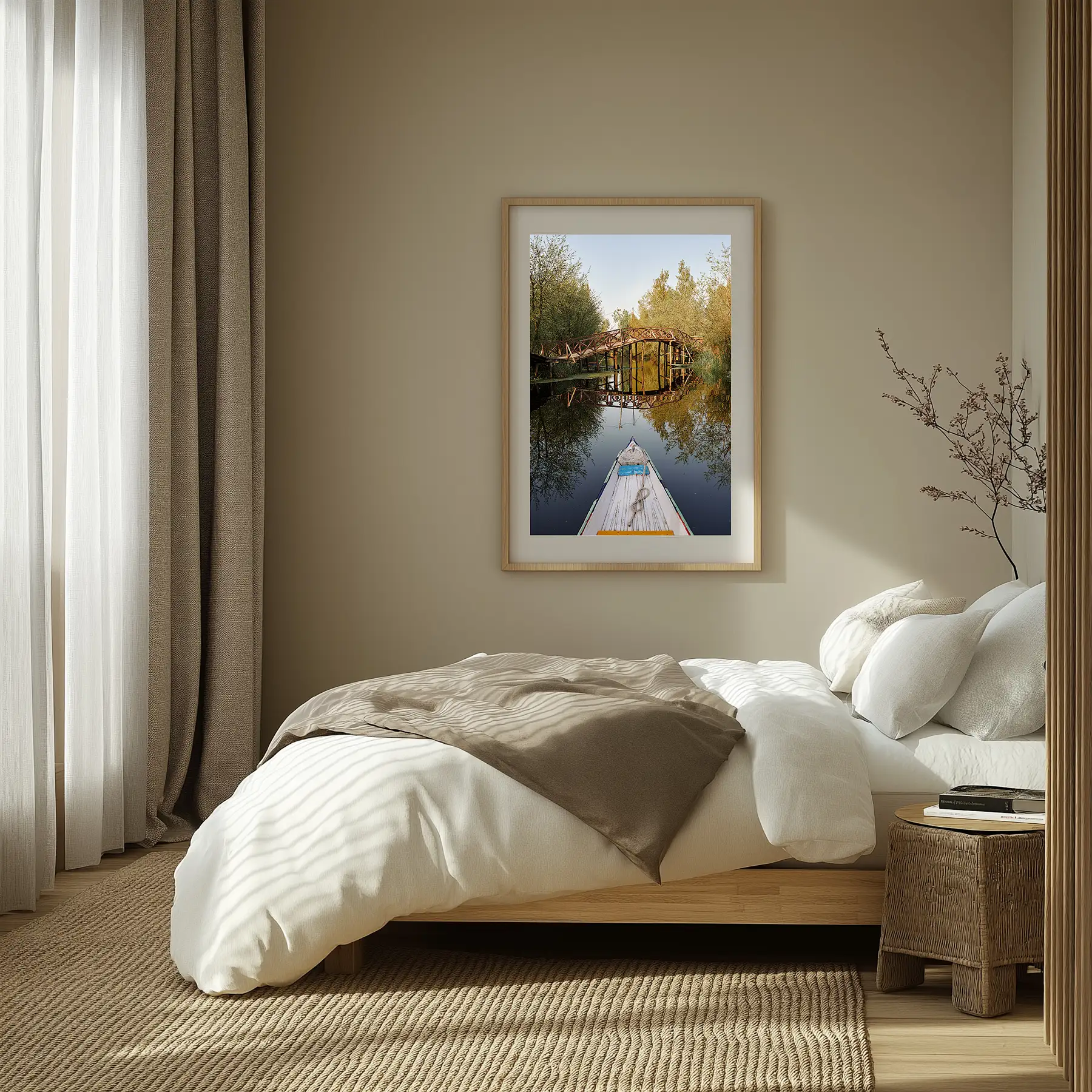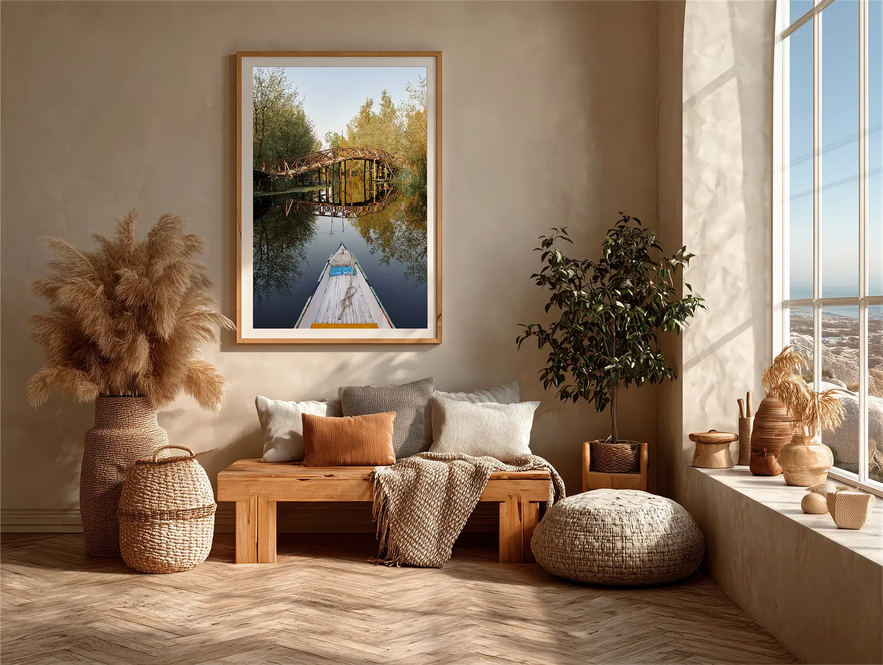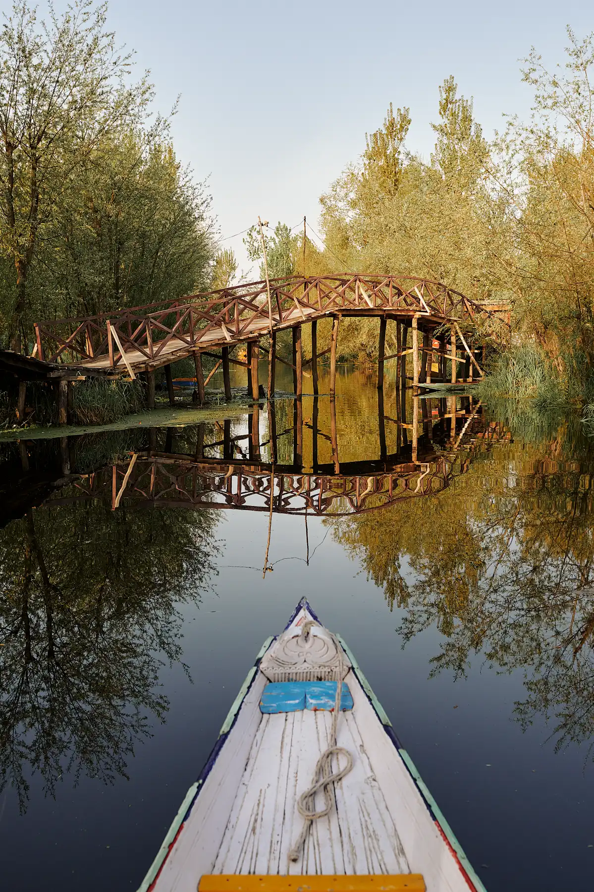 A wooden bridge arches gracefully over a tranquil canal on Dal Lake in Srinagar, perfectly reflected in the glassy morning water. Viewed from the prow of a shikara, the scene captures the serene beauty and timeless charm of life on Kashmir’s iconic lake.