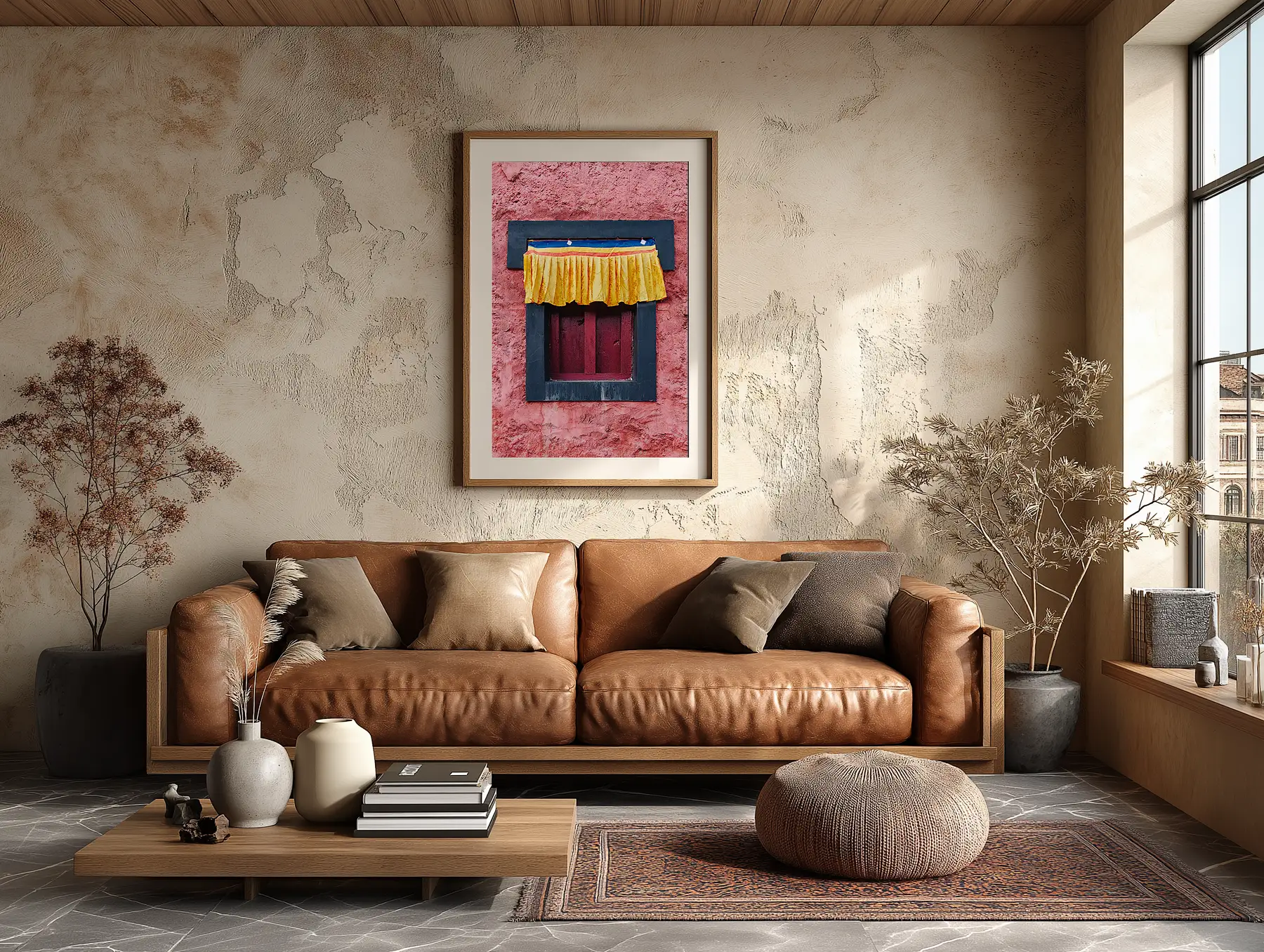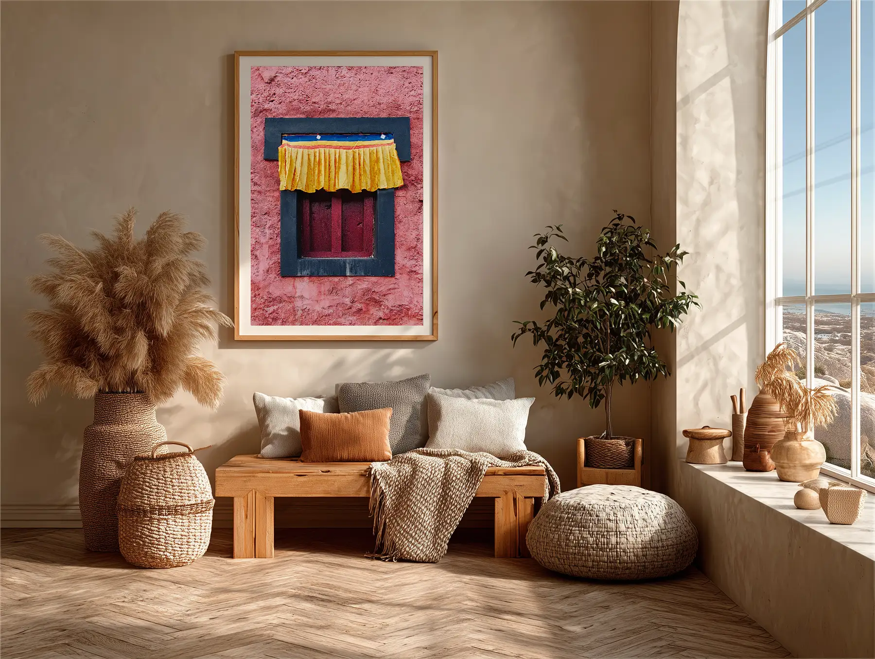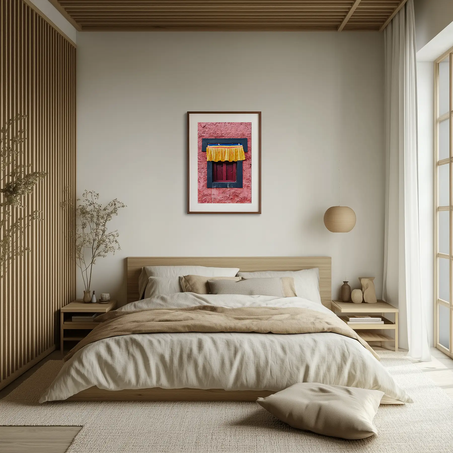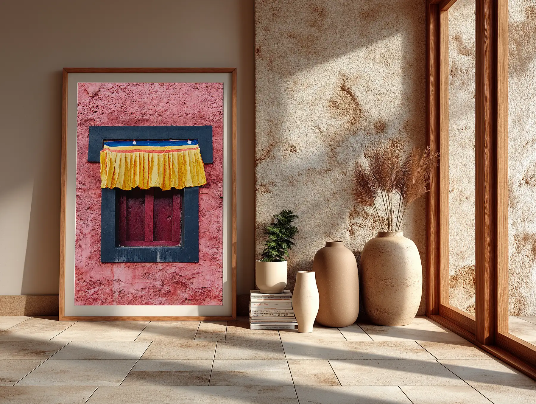 A vibrant window framed by a bold red wall and adorned with a traditional yellow cloth, reflecting the colorful spirit and cultural richness of Ladakh’s architecture. This simple yet striking detail captures the harmony of tradition and artistry that defines the region’s timeless charm.